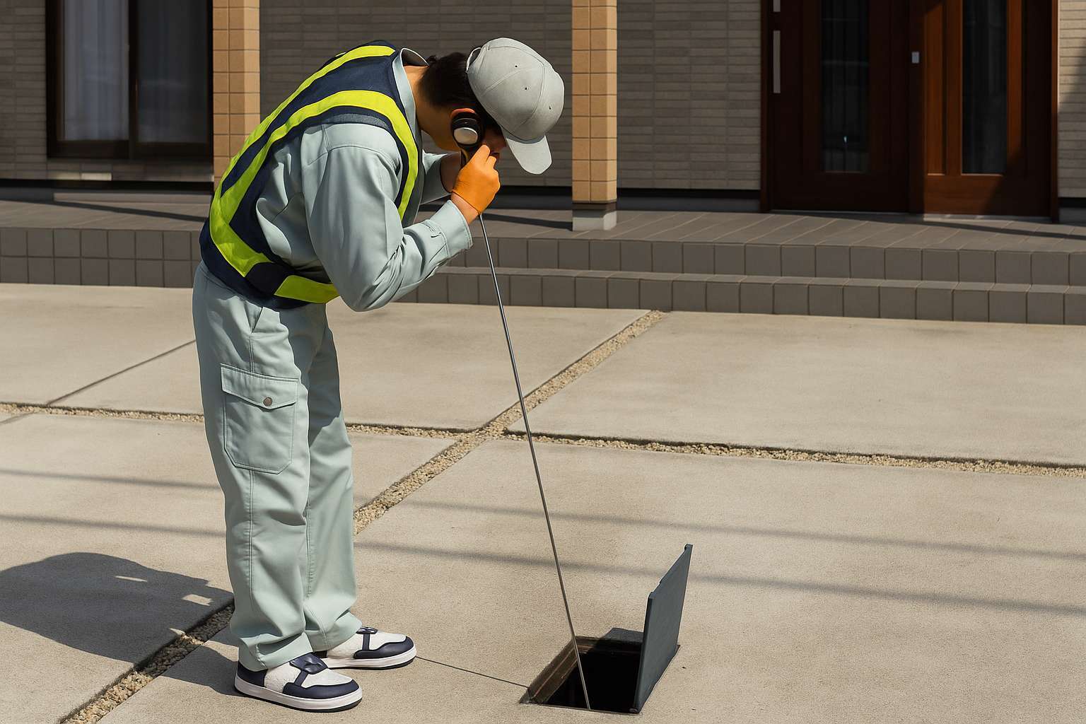 屋内で異常が見つからない場合や、漏れの範囲をさらに広く確認したい場合に行うのが屋外調査です。地中に埋設された配管に発生する微細な漏水音を、グランドマイクを用いて正確に捉えることで、掘削を行わずに位置の見当をつけることができます。コンクリート舗装や駐車場下など、目視で確認できない環境においても有効な調査手法です。