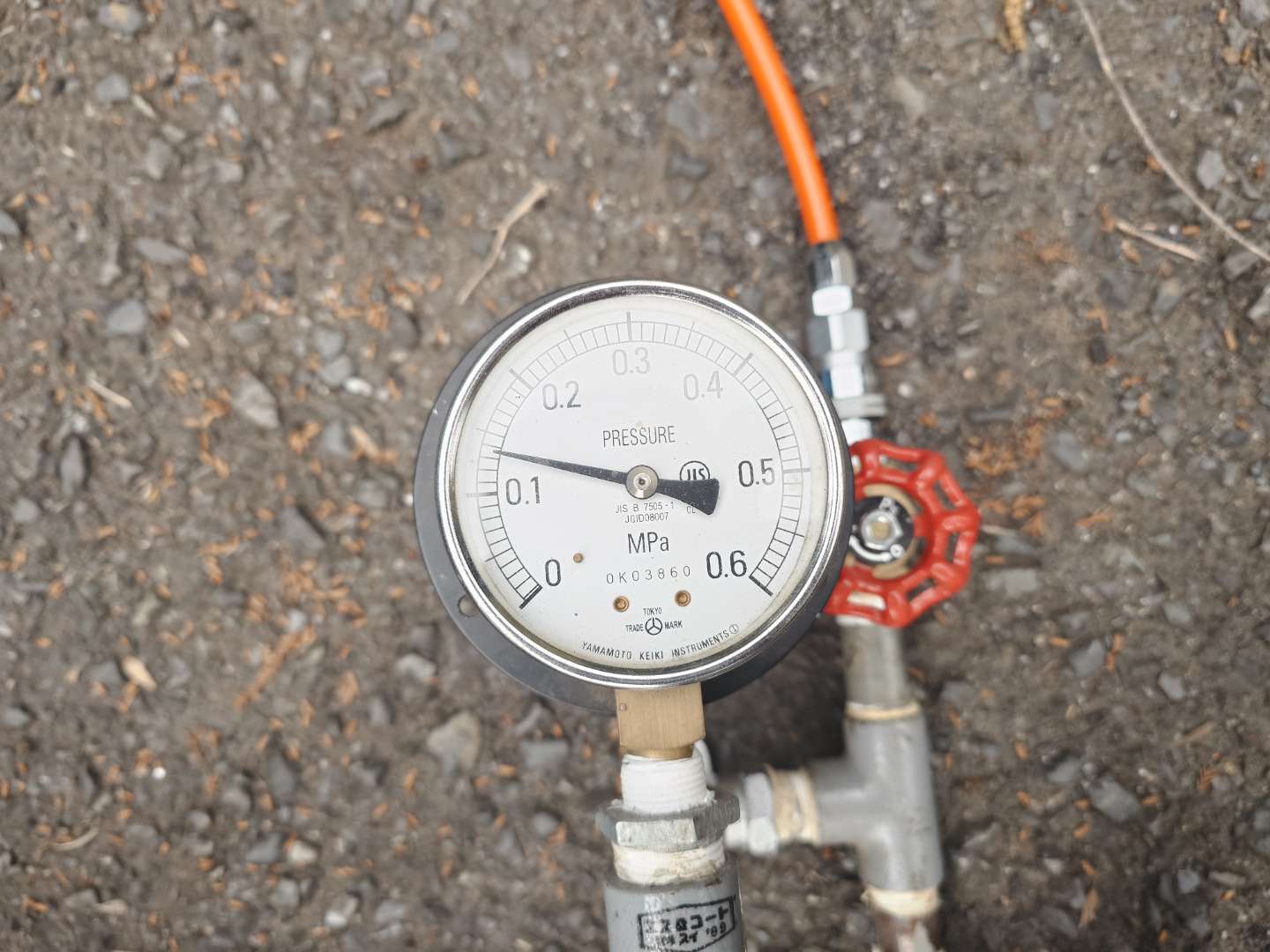 [写真:トレーサーガス注入圧力の調整事例|配管の使用年数や経路の距離、口径、漏水量など、現場の条件に合わせて注入圧力を調整している様子]