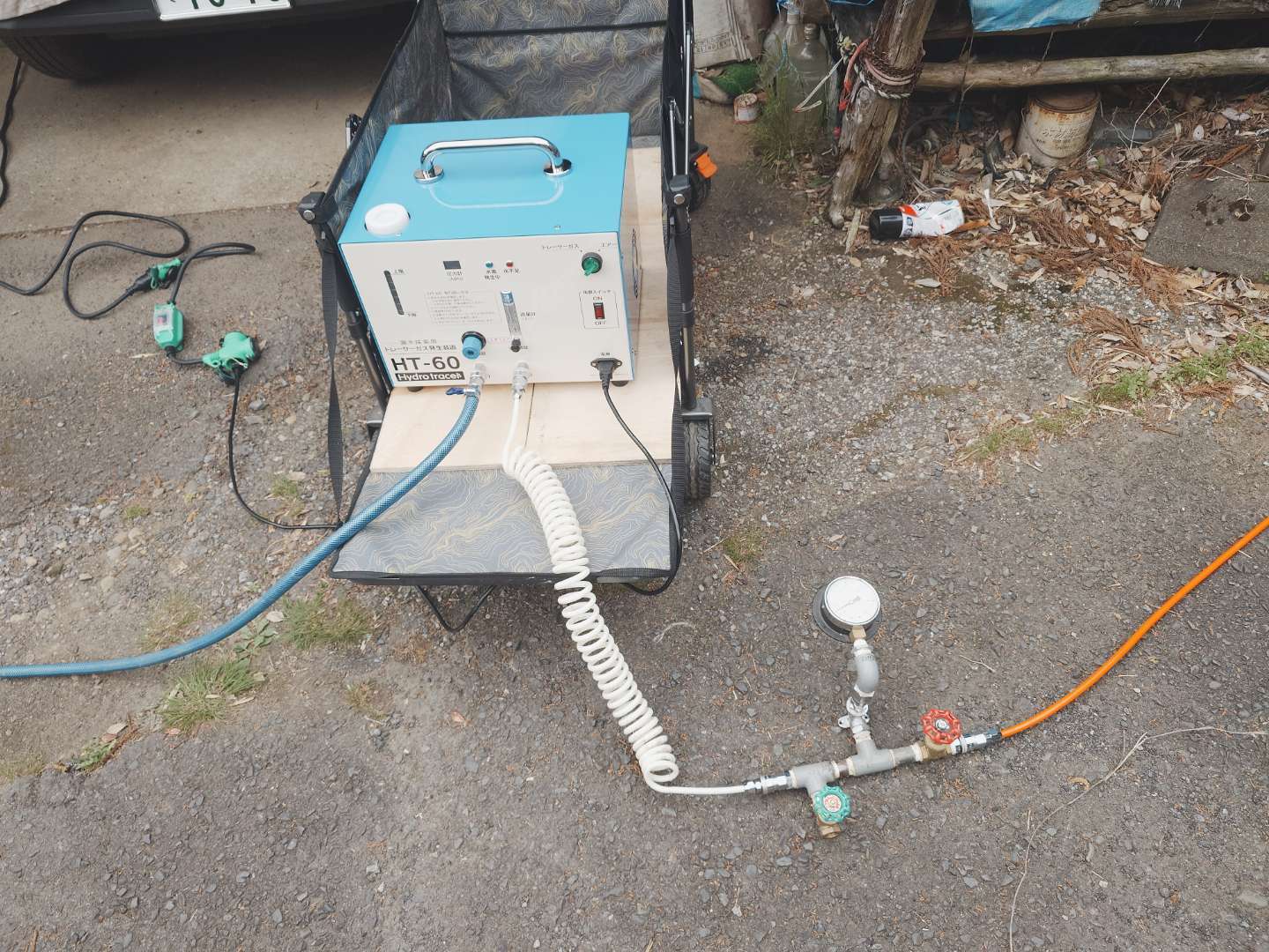[写真:トレーサーガス発生装置の据え付け事例|注入ホースとドレンホースを接続し、ガス注入の準備を進めている現場の様子]