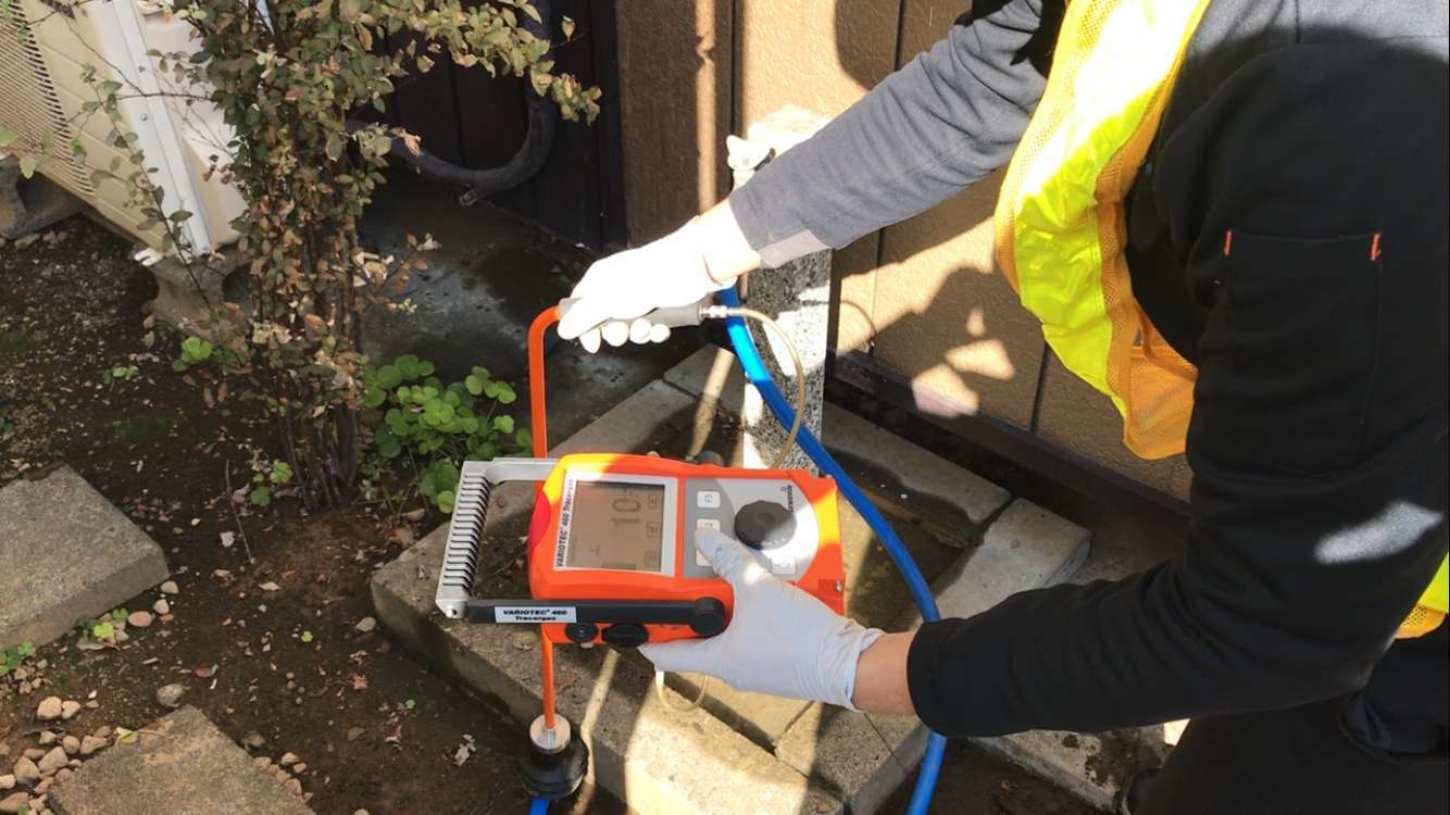 地表にガスが出にくい場合は、建物周辺の境界部や立ち上がりのモルタル隙間など、わずかな空気の通り道を重点的に調べます。