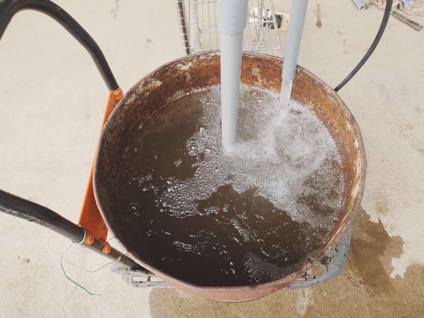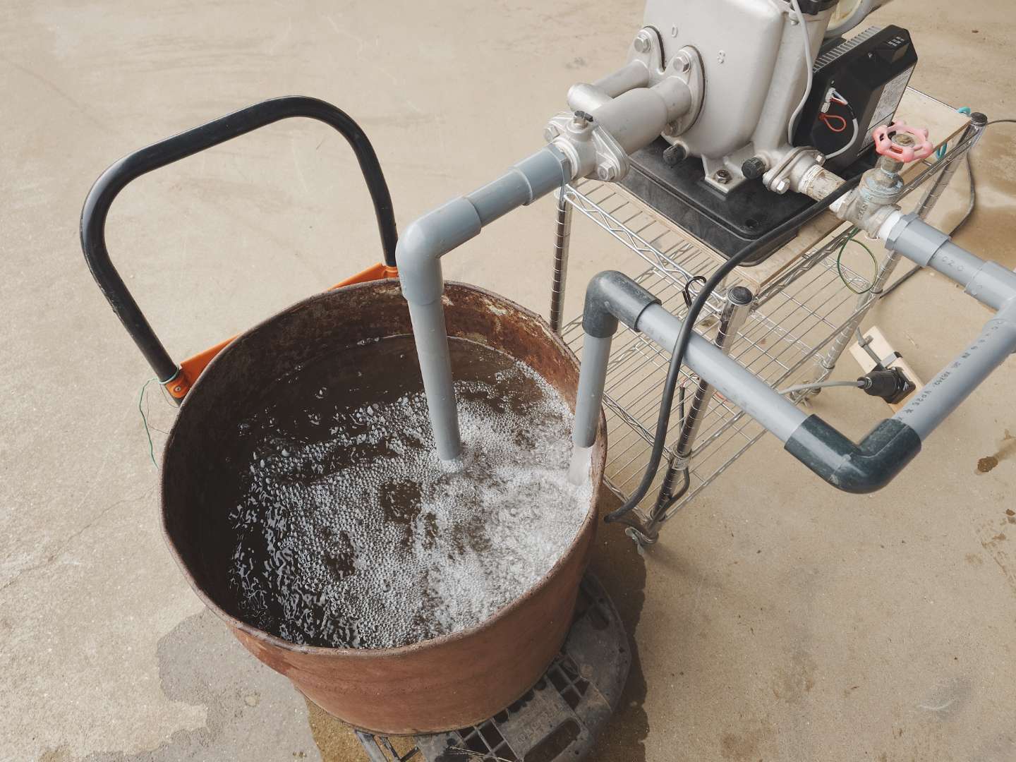 そこで、仕上げとして実際の揚水動作を通じた性能確認を行いました。水槽を利用して「吸い上げ → 吐き出し」を繰り返し、残留汚れを洗い流しつつ揚水性能を点検しています。