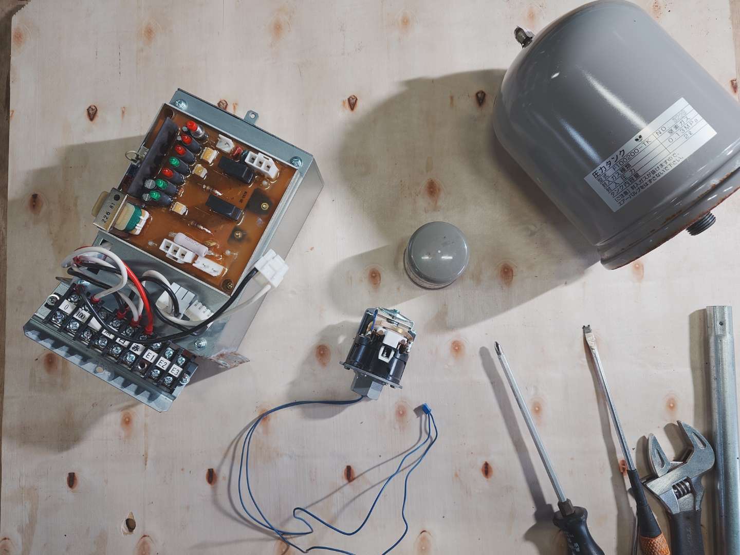 - アキュームレーターは寿命のため新品に交換。交換後は水圧が安定し、起動回数も正常に戻った。