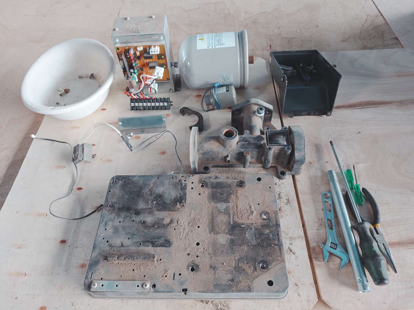 羽根車や回転軸には水垢や鉄分の付着が見られましたが、清掃により揚水性能を回復。圧力スイッチやフロースイッチは分解清掃で延命でき、寿命を迎えていたアキュームレーターは交換によって水圧保持を改善しました。