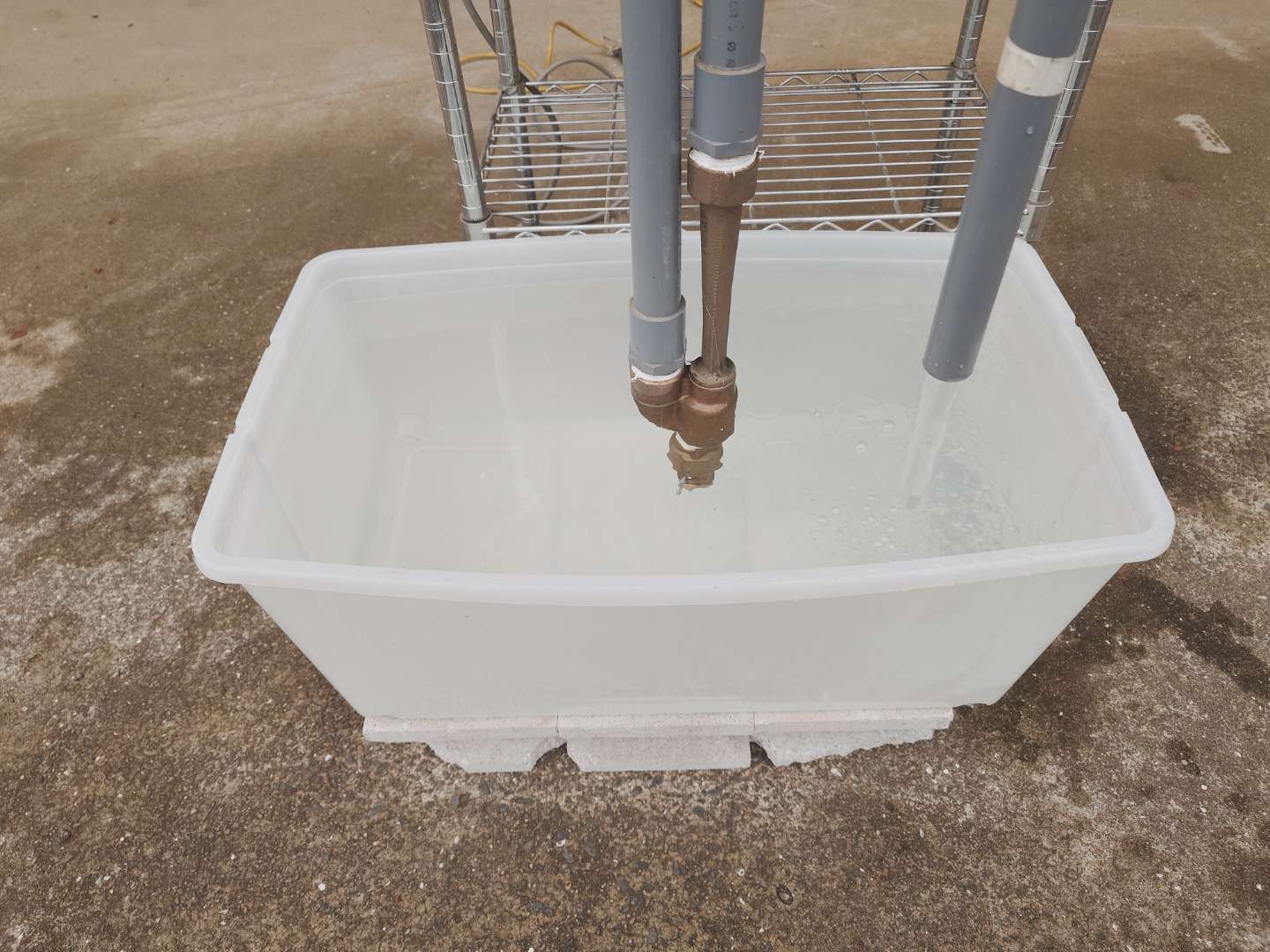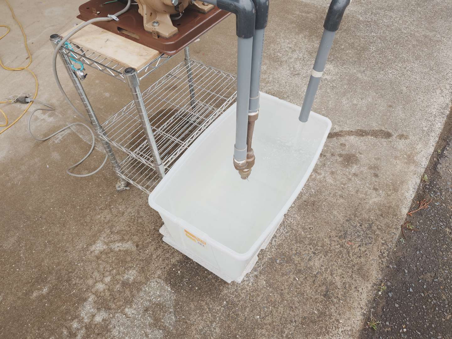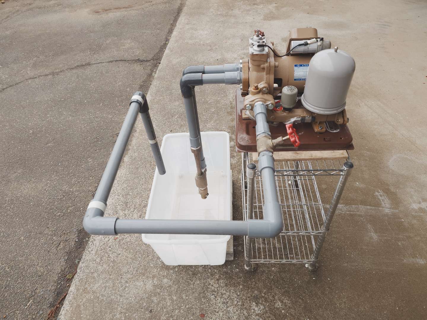 ポンプ本体・揚水管・吐出管・水槽をセット。水槽に清水を張り、呼び水を実施。電源遮断状態で漏水チェックを先に済ませます。