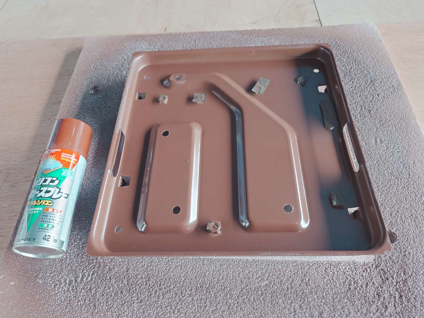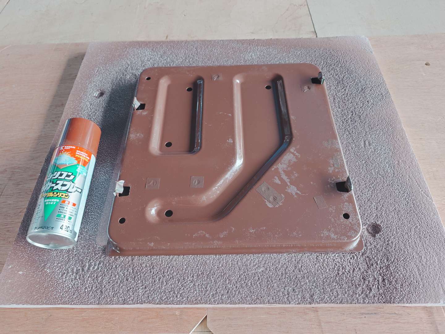 ①台座を清水で洗浄 → ②ケレンで錆を除去し素地を調整 → ③脱脂後、防錆スプレーで塗装の順で施工(写真は表面と裏面)。屋外保管や湿潤環境で腐食が進むため、ストック品でも防錆は必須です。