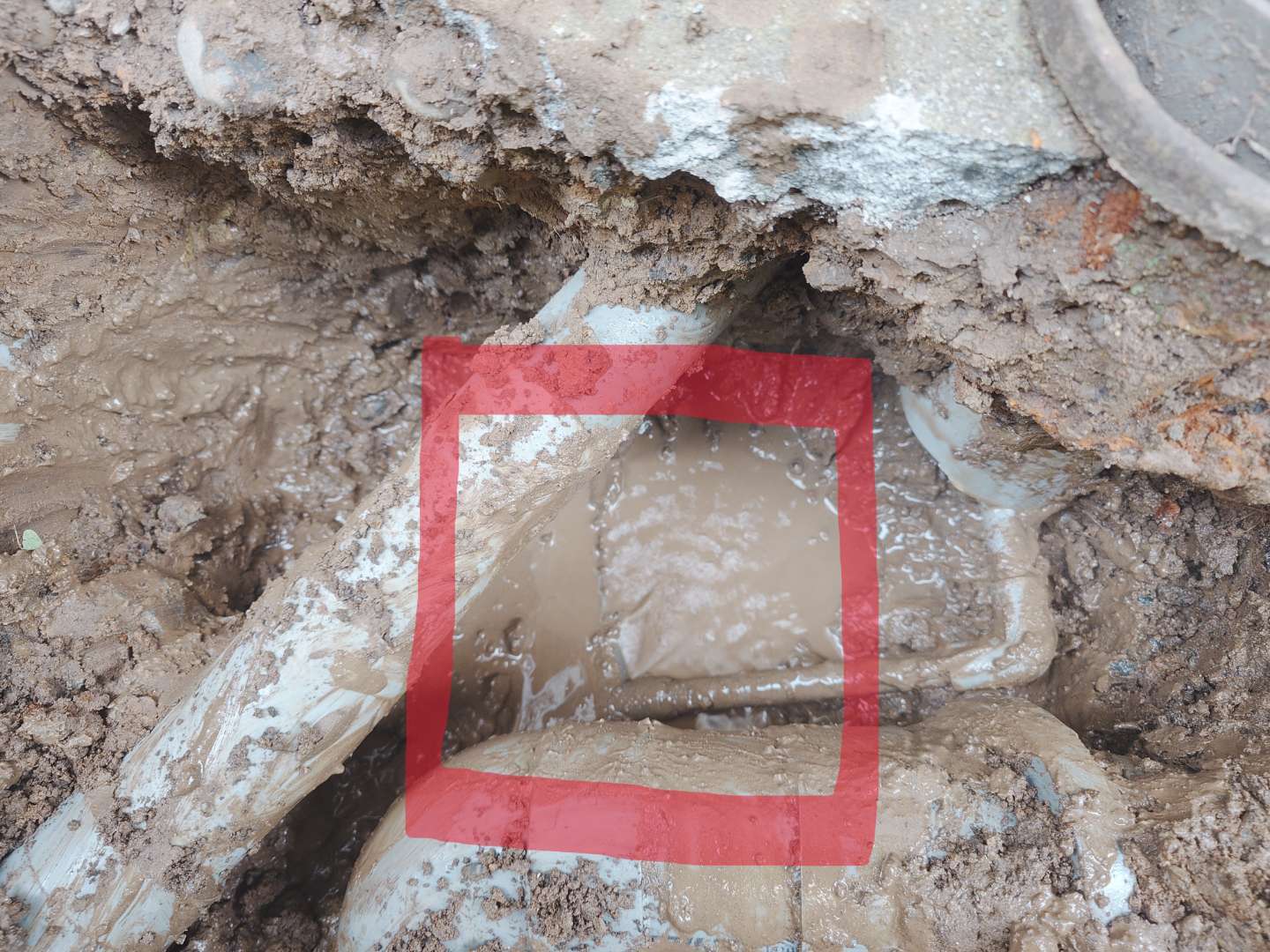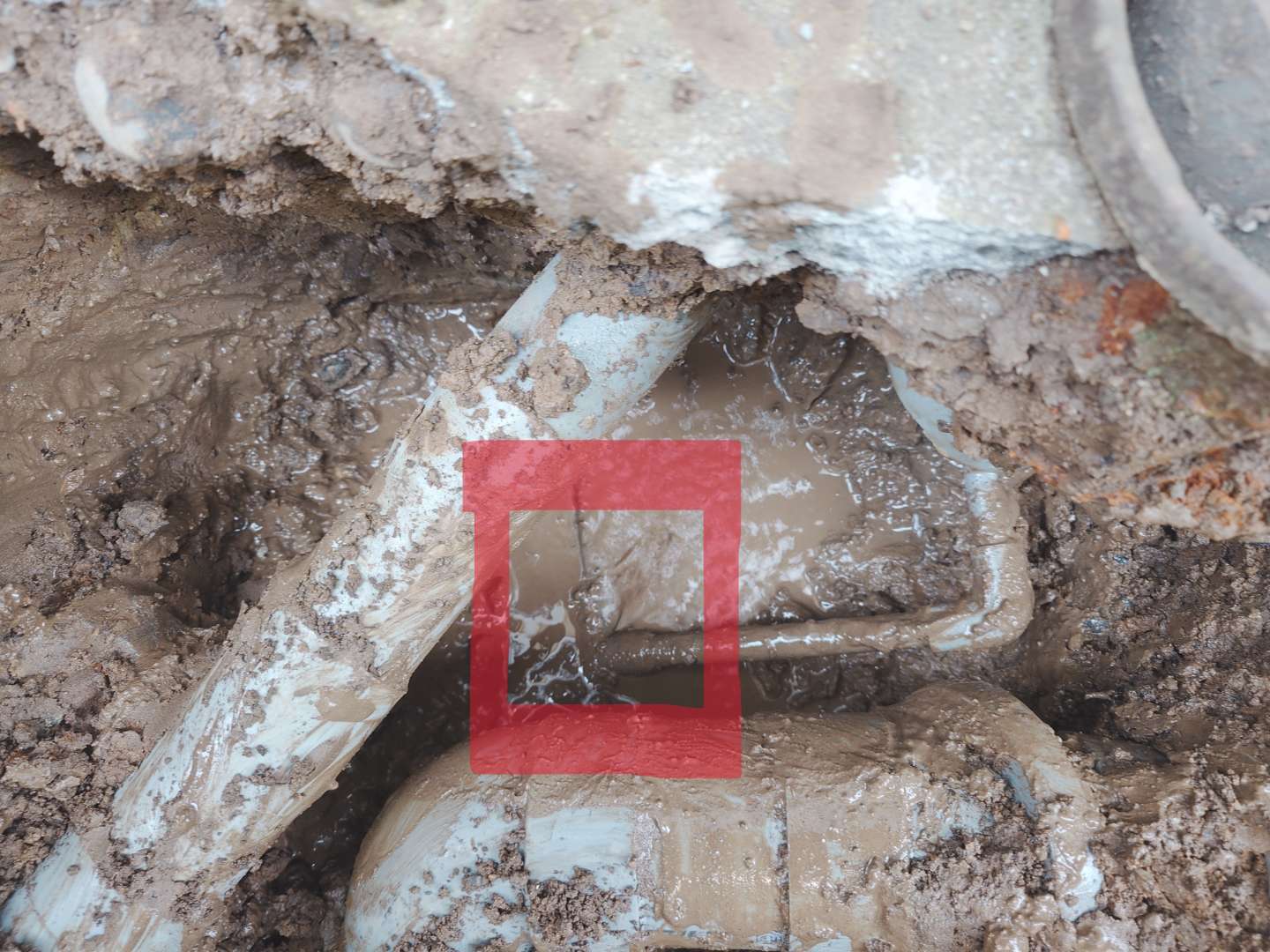検知ポイントを最小限に掘削し、継手部の亀裂から水がにじみ出しているのを確認。音も水跡も出ない原因が明らかになりました。