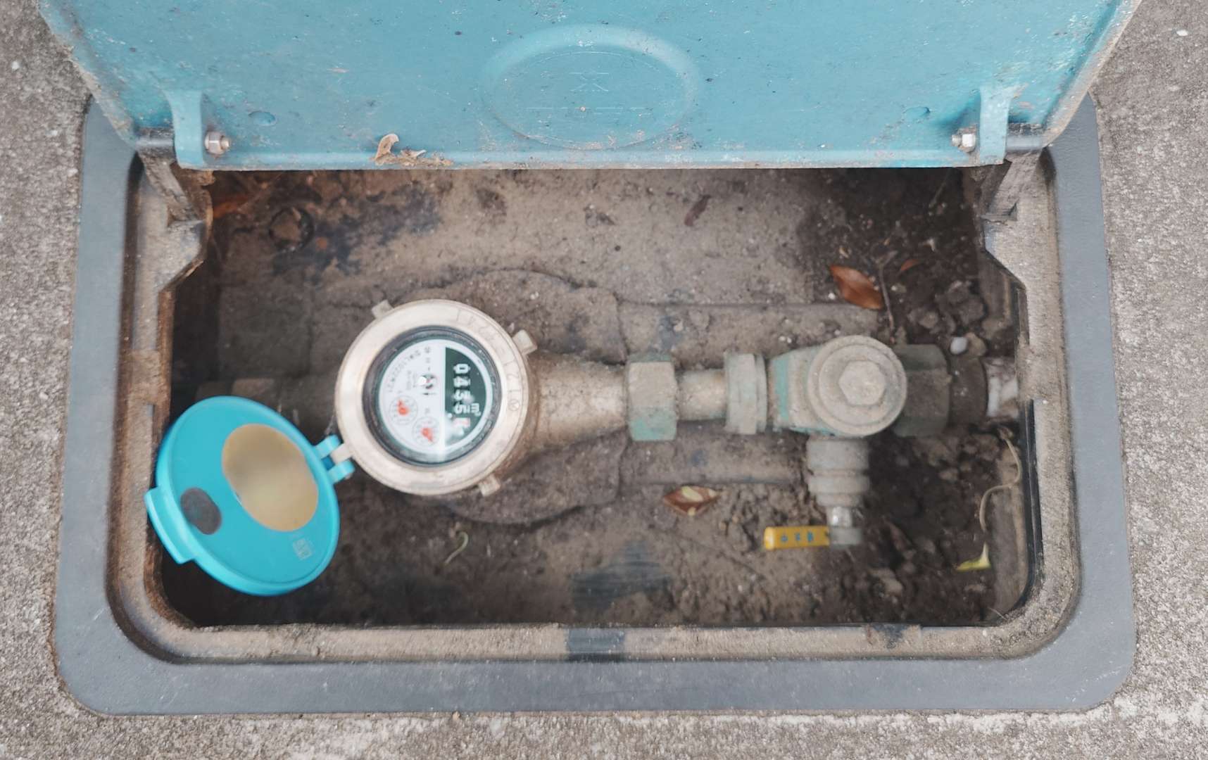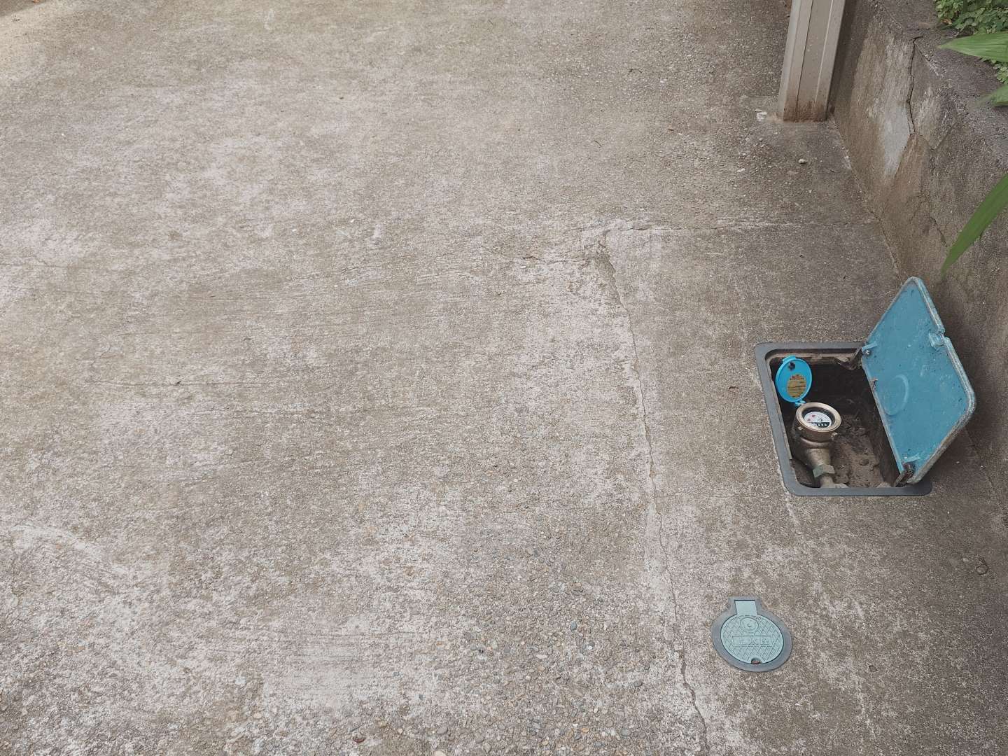 写真:水道メーター周辺の全景 ― 検針で使用量の増加が判明。メーターのパイロット挙動は重要な手掛かりです。
