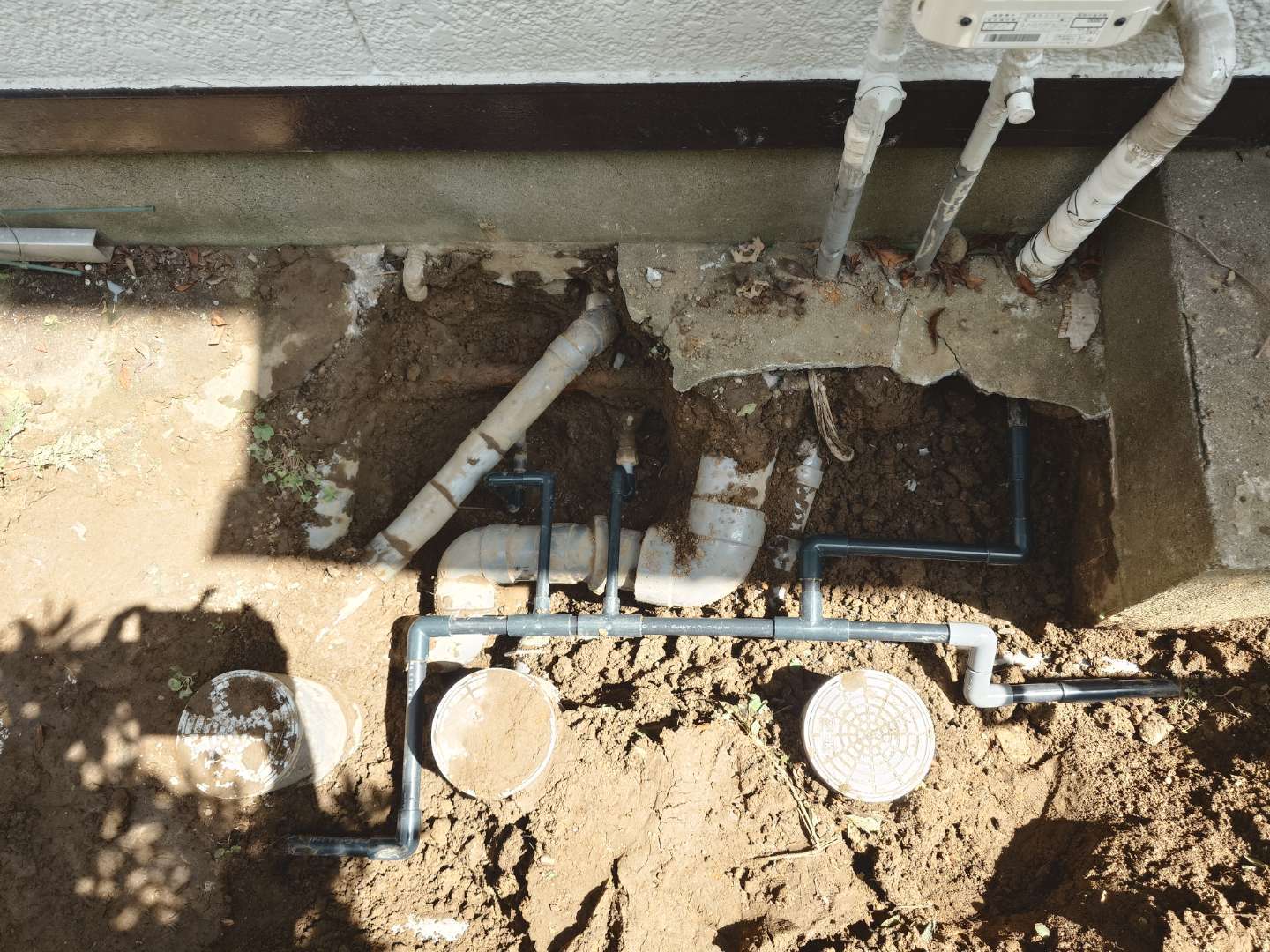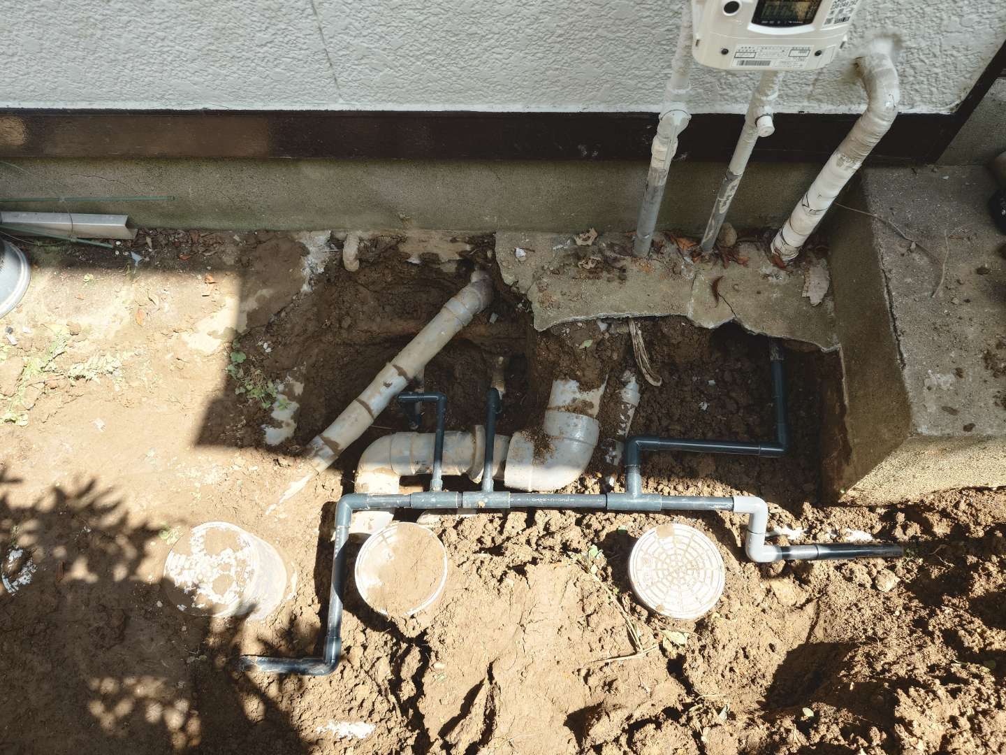 今回の現場では、給水管・給湯管・排水管が建物外周の限られたスペースに集中して埋設されていました。そのため、掘削後に作業スペースを確保するのが難しく、工具を動かす範囲も制約を受けました。