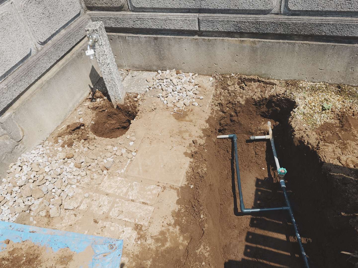 今回の現場は砂質の地盤で、水はけが非常に良く、漏れた水はすぐに地中へ吸収されます。そのため、外観からは湿りや水たまりが全く確認できず、地表は乾いたままになります。地盤の種類によっても漏水の見え方は変わり、粘土質では多少表面に湿りが出る場合もありますが、砂地や排水性の良い敷地では完全に見えないことが多いです。