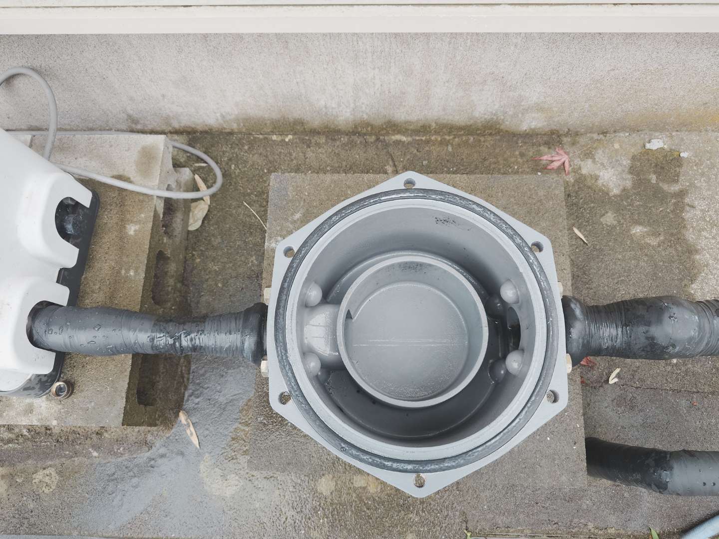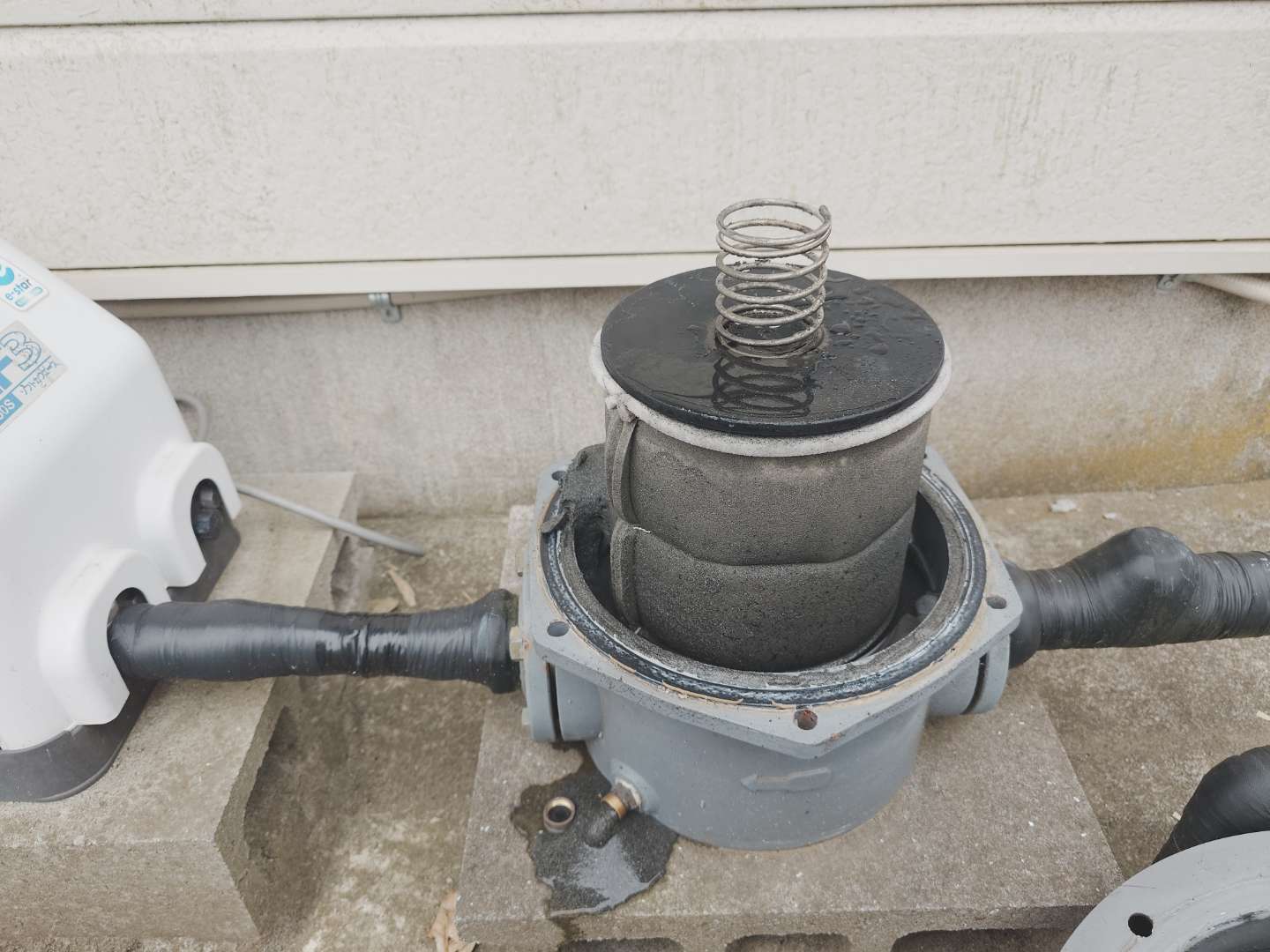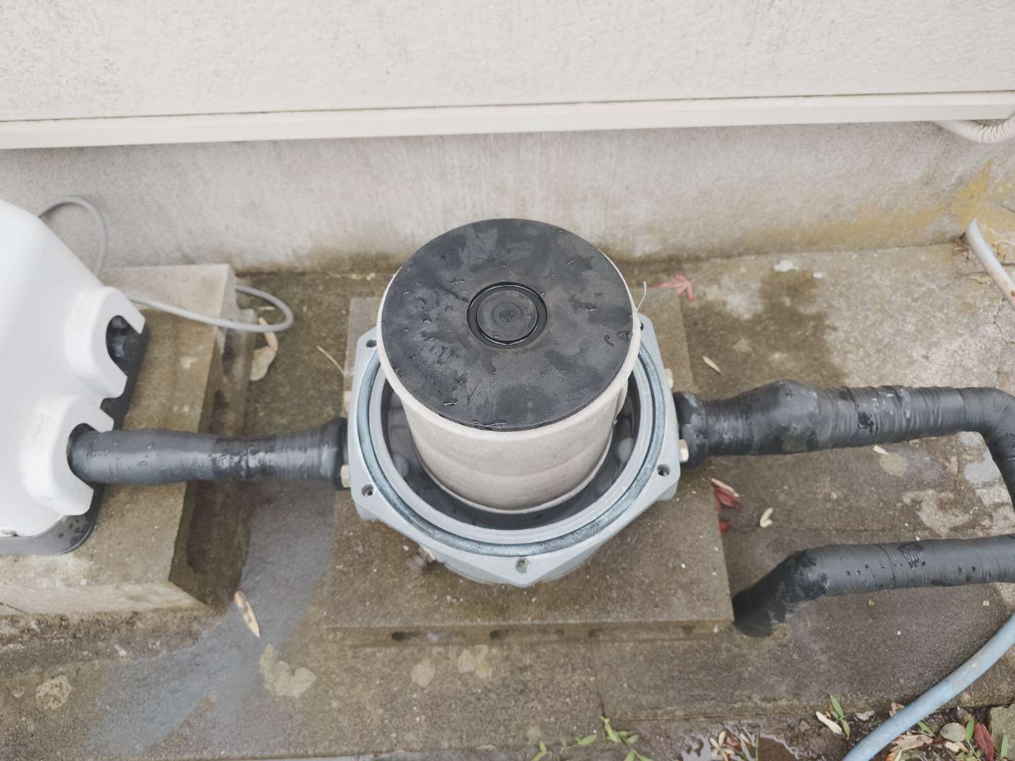 本件では、上蓋・フィルター・本体内部に堆積した砂を分解清掃で除去し、通水状態を確認しました。清掃間隔は本件現場での目安が6〜8ヶ月であり、砂の混入量や使用状況により変動します。濁りや砂粒の混入、出水の弱さ、ポンプの起動回数の増加が続く場合は、清掃時期のサインとなります。