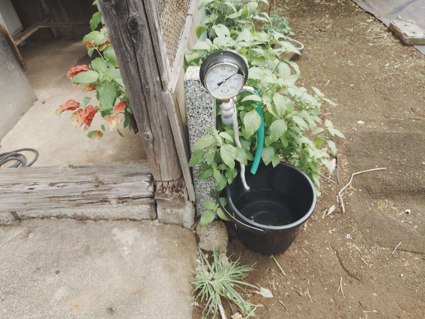 ▪️ 井戸ポンプの動水圧は0.43MPa。ポンプを停止するとすぐに0MPaまで低下し、大量の漏水が疑われる。