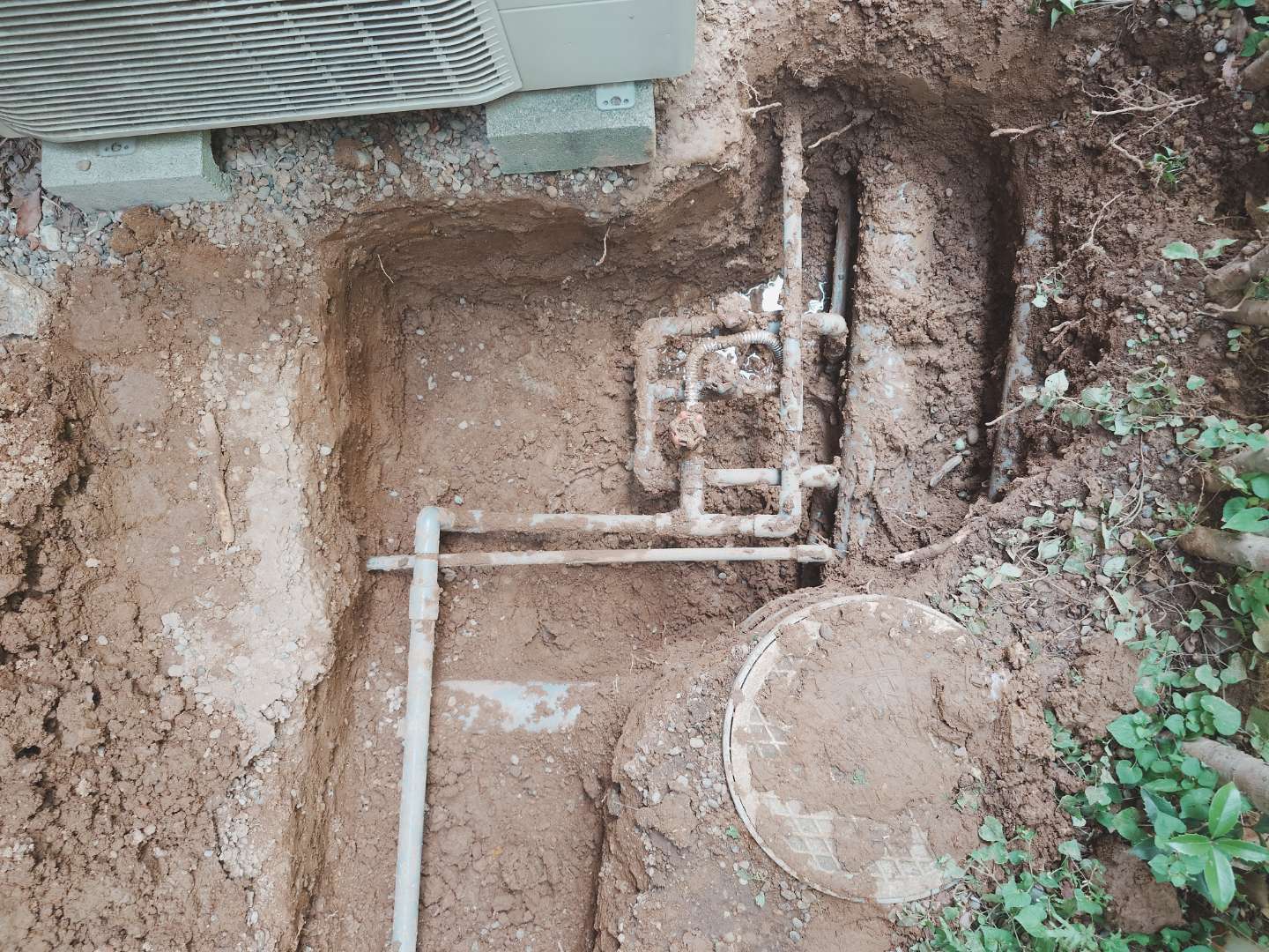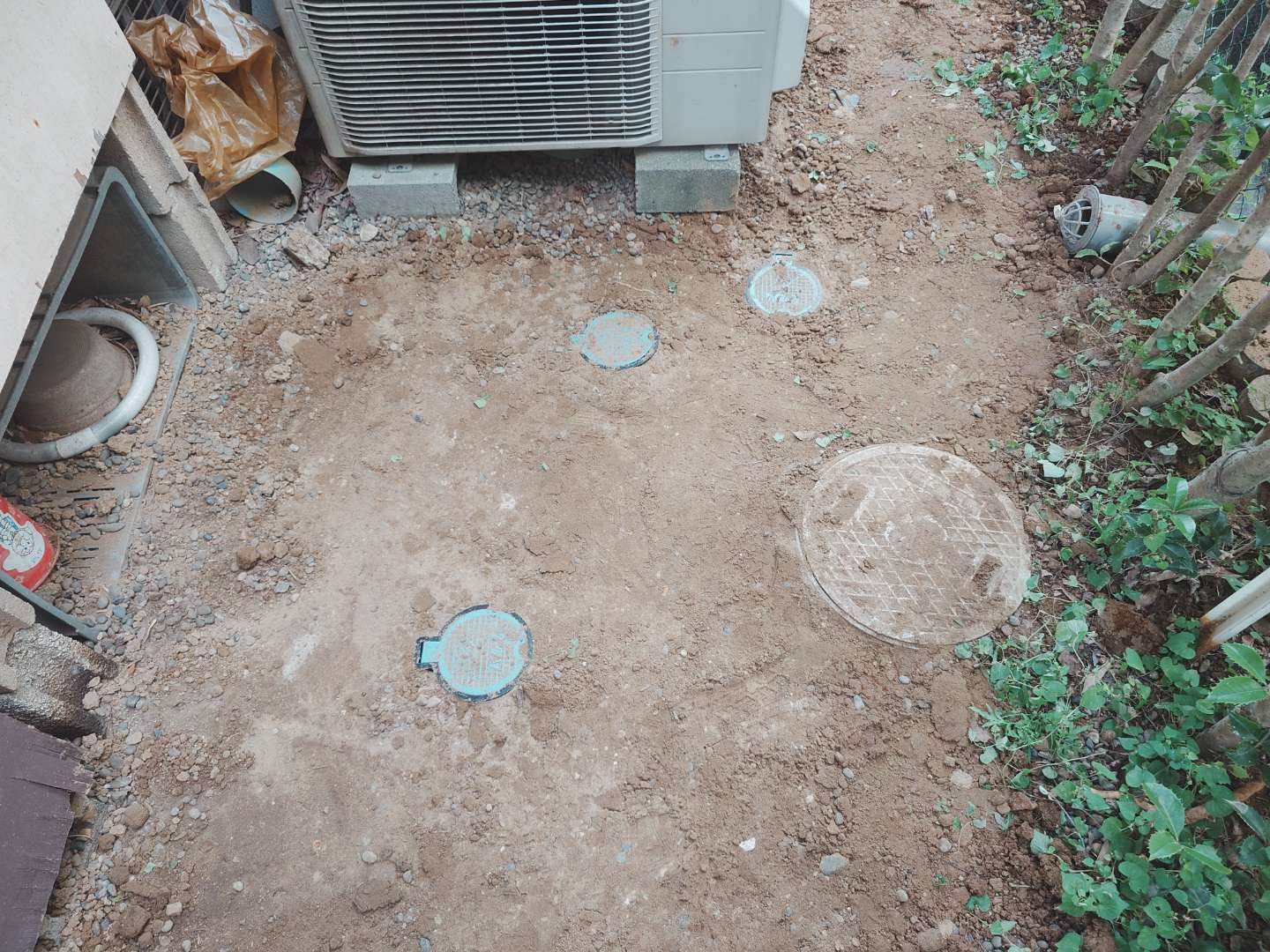 コンクリート部の復旧は、再打設を避けて発生土埋戻し+玉砂利仕上げとしました。これにより、再調査や点検が必要になった場合でも、掘削範囲を局所に抑えることができます。また、老朽化していた配管の一部は耐衝撃性の高いHIVP管に更新し、将来的な再発リスクを軽減しました。埋設深度や勾配も再調整し、滞留や負圧が発生しにくい経路へ改良しています。